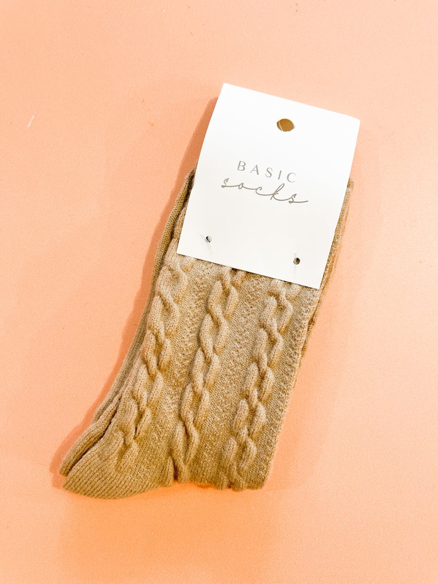 - **Beige Cable Knit Crew Socks by Angel Accessories - The classic cable knit design adds a touch of elegance and the crew length provides extra coverage. Perfect for everyday wear or lounging at home. Sizing: Women's 5-1 - **socks are now Latte (darker) see individual pic