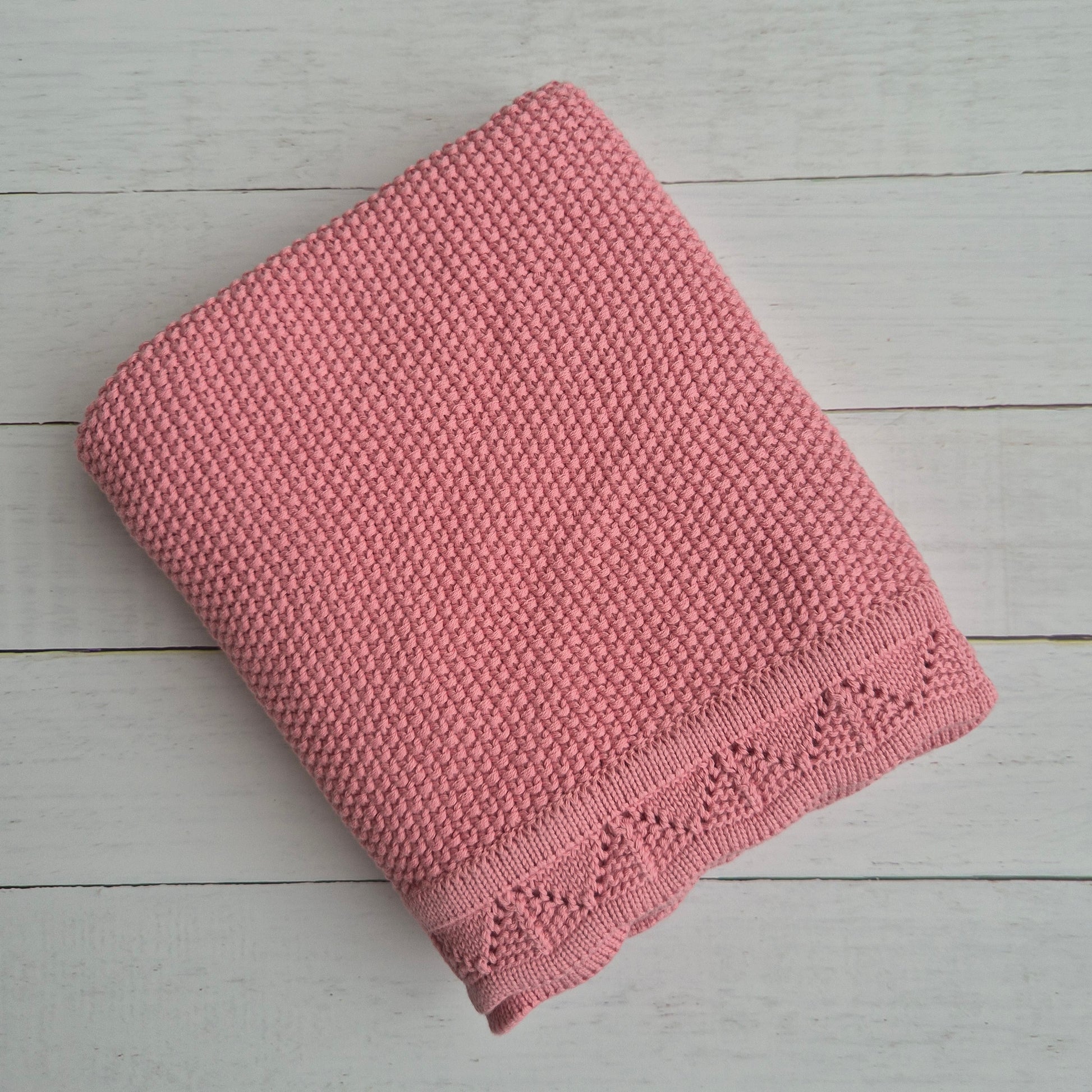 - Cotton Knit Baby Blanket -100% cotton 80x100cm, beautiful crochet patterned edge, GOTS certified (Global Organic Textile Standard) in Rose Pink