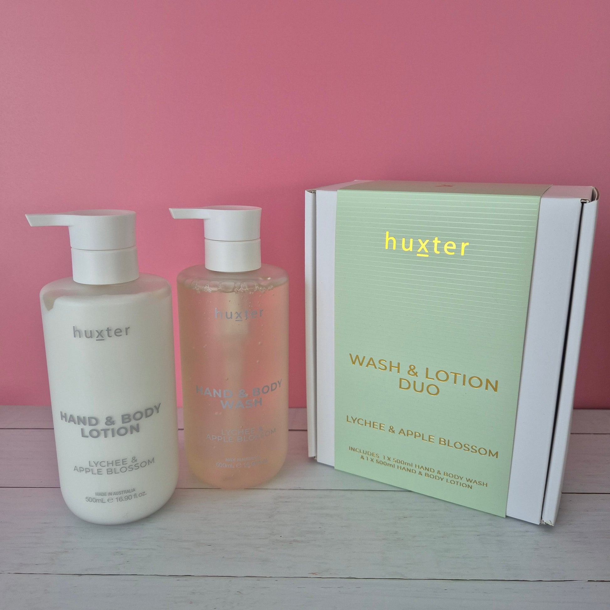- Huxter Home Wash & Lotion Duo Gift Box - Lychee & Apple Blossom - Bursting with juicy fragrance and nourishing care, this duo is a treat for your skin and your senses. What's inside: 1 x 500ml Hand & Body Wash & 1 x 500ml Hand & Body Lotion. Enriched with skin-loving ingredients like aloe vera and shea butter, the wash cleanses gently while the lotion hydrates for a smooth, supple finish. Scented with Lychee & Apple Blossom, this fruity-floral blend is playful and fresh, like bottled sunshine.